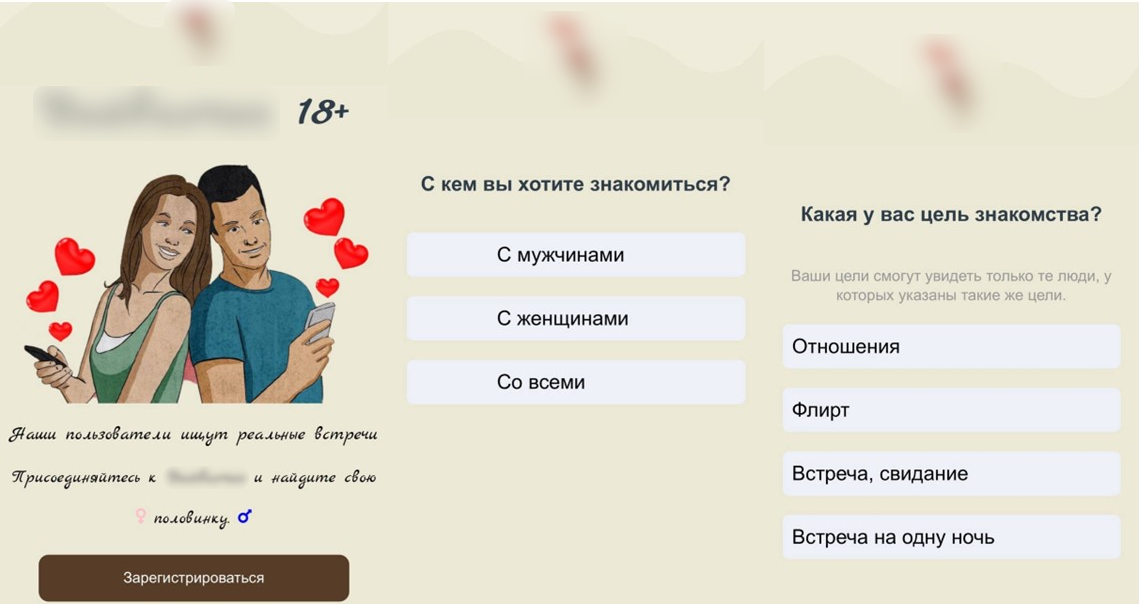 После установки приложение имитирует опрос для создания анкеты. Пользователю предлагают выбрать свой пол, спрашивают, с кем он хотел бы познакомиться, уточнить цель общения и внешние предпочтения.