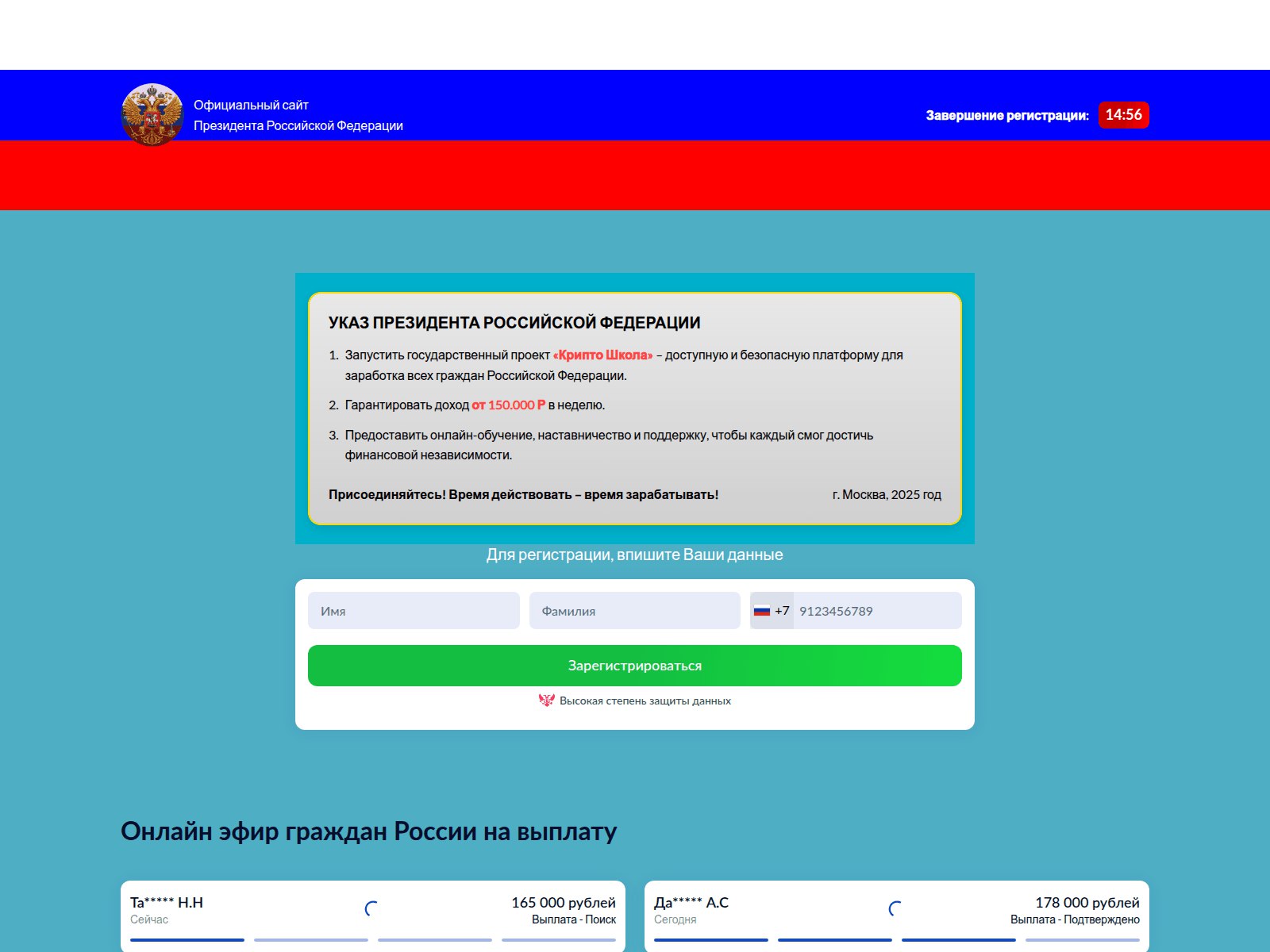Компания F6, ведущий разработчик технологий для борьбы с киберпреступностью, зафиксировала новую тактику мошенников для привлечения потенциальных жертв в схемы инвестскама. Под видом официального сайта главы государства злоумышленники создали фейковый ресурс, на котором разместили ложную информацию о запуске госплатформы для заработка граждан с обещанием дохода от 150 000 рублей в неделю.