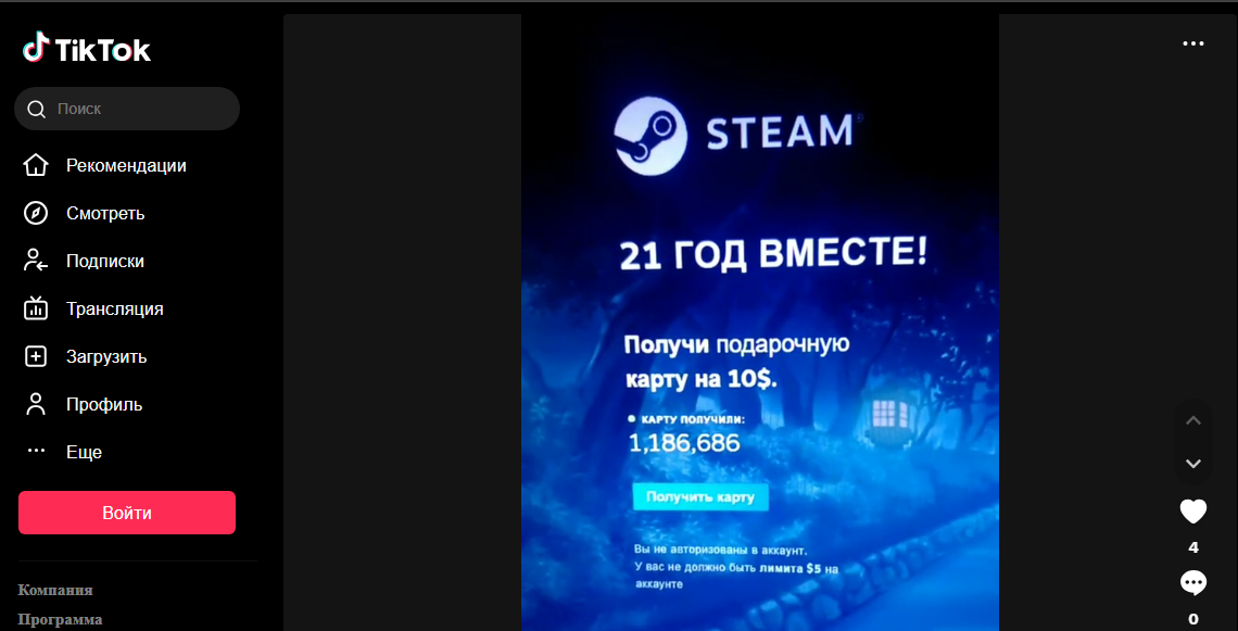 Ловушки для пользователей Steam мошенники расставляют в YouTube, TikTok и других известных видеохостингах. Злоумышленники размещают короткое видео, на котором показывают фишинговый ресурс с ложной информацией о раздаче гифт-карт Steam номиналом от $5 до $50. Ссылку на фишинговый сайт размещают в описании профиля канала. Также в отдельных роликах на YouTube показывают ссылку на Telegram-канал, через который также распространяют мошеннические ссылки.