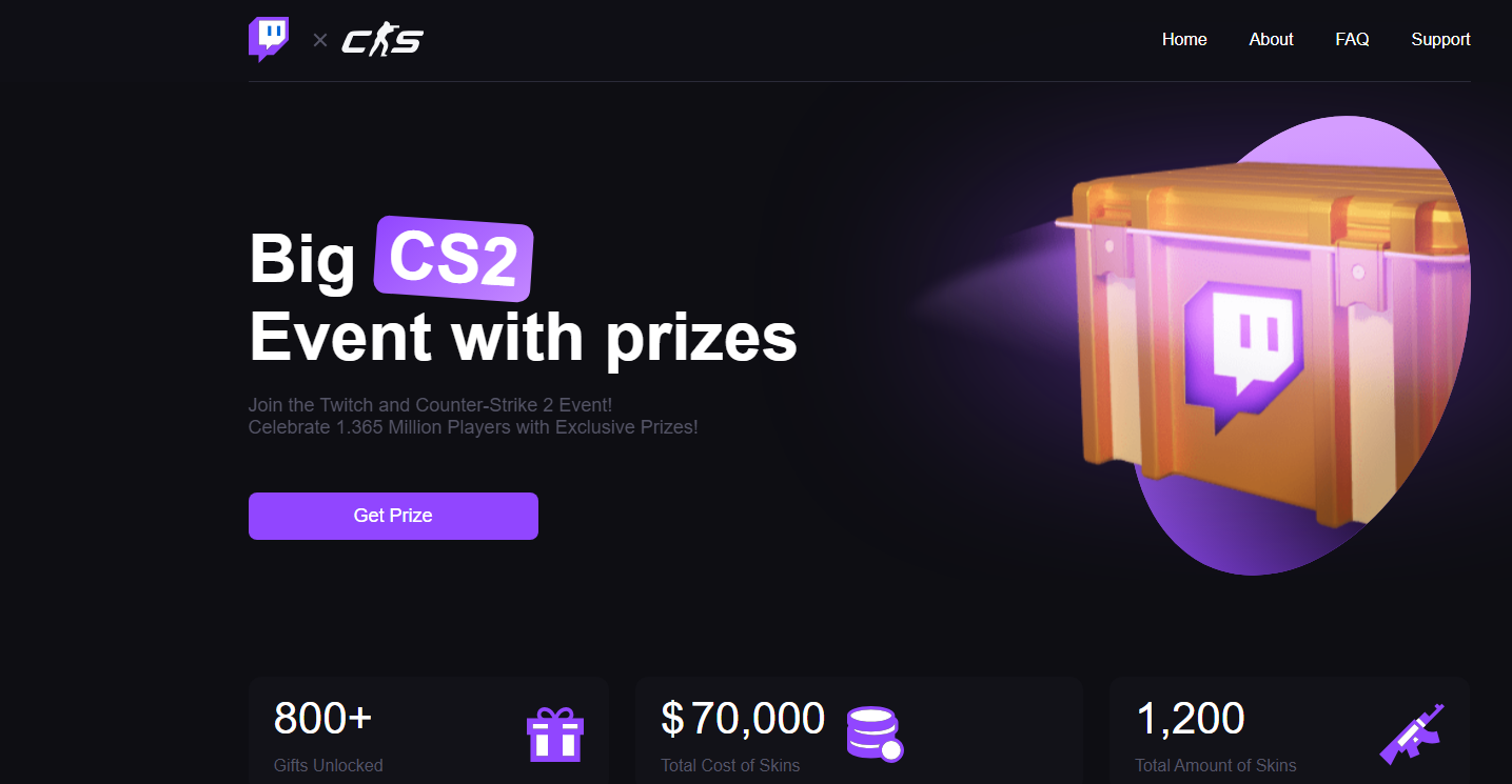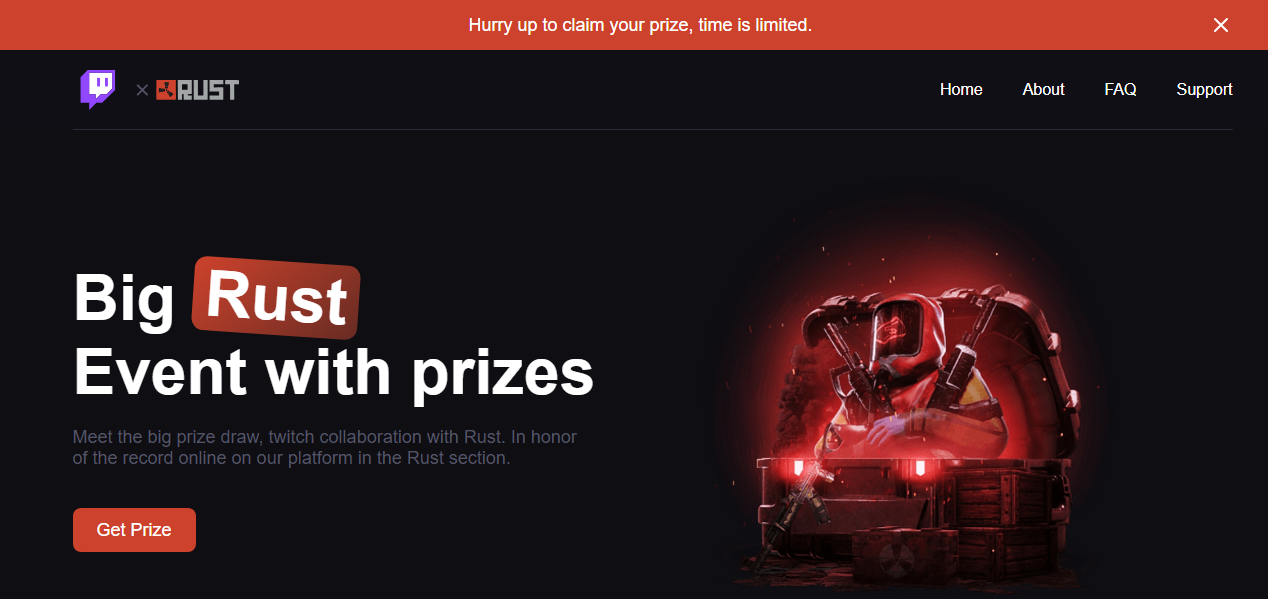 В других случаях фейковые сайты Twitch обещают «приз» – бесплатные скины для игр CS2. Схема обмана более простая: при нажатии кнопки «Get Prize» на фейковом сайте открывается новая вкладка, которая внешне выглядит как легитимная страница – но при внимательном рассмотрении можно увидеть, что этот адрес указан как текст на странице, реальный домен отображается в адресной строке браузера.