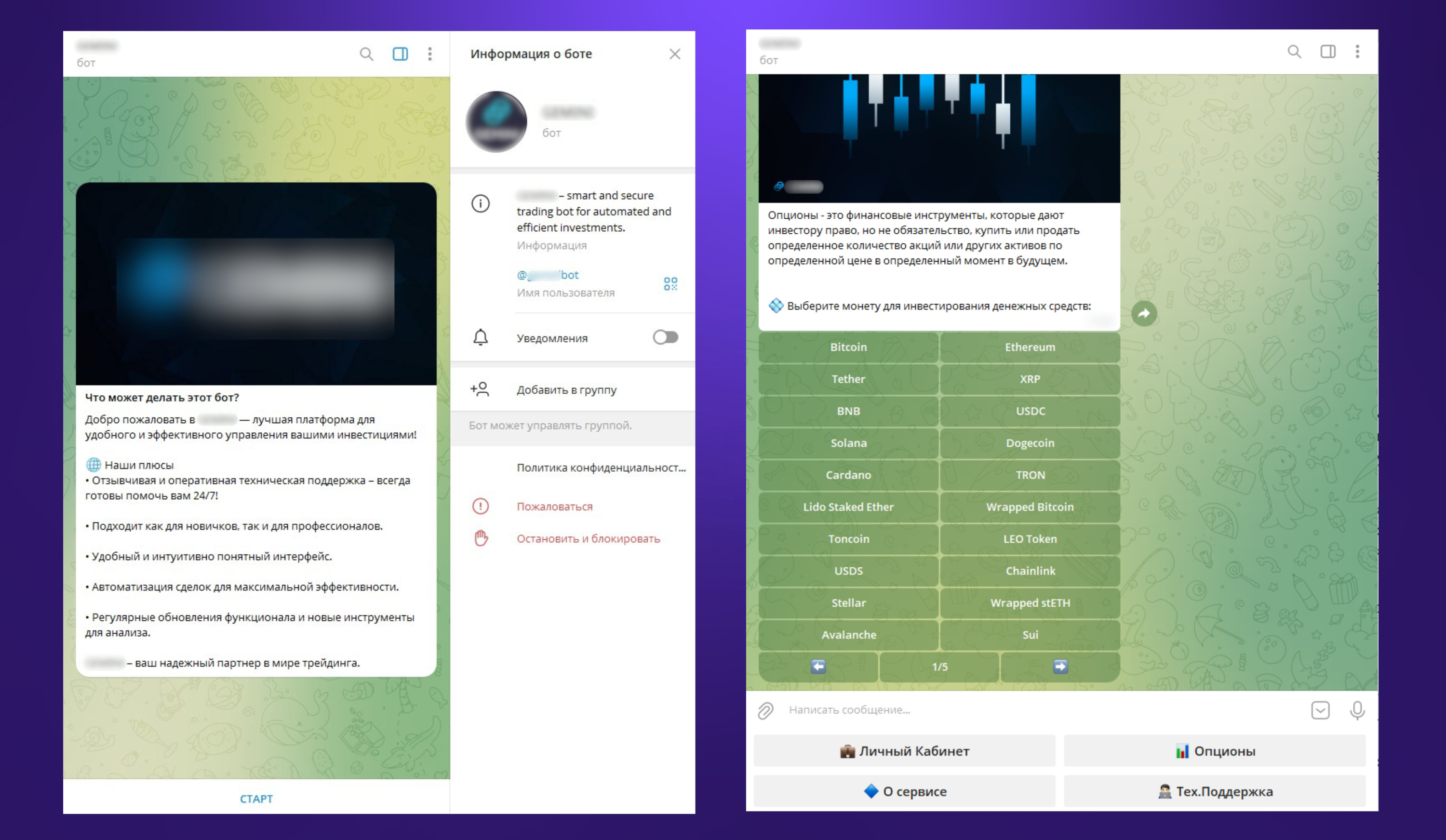 Второй сценарий предполагает, что «девушка» обращается к кавалеру за помощью в инвестировании. Злоумышленник от лица новой «знакомой» пишет, что ей заблокировали доступ в «трейдинговый» Telegram-бот, и просит жертву зарегистрироваться в нём, обещая, что пополнит баланс «сама». Расчёт мошенников строится на то, что кавалер знает: терять ему нечего, своими деньгами он не рискует, – и согласится помочь.
