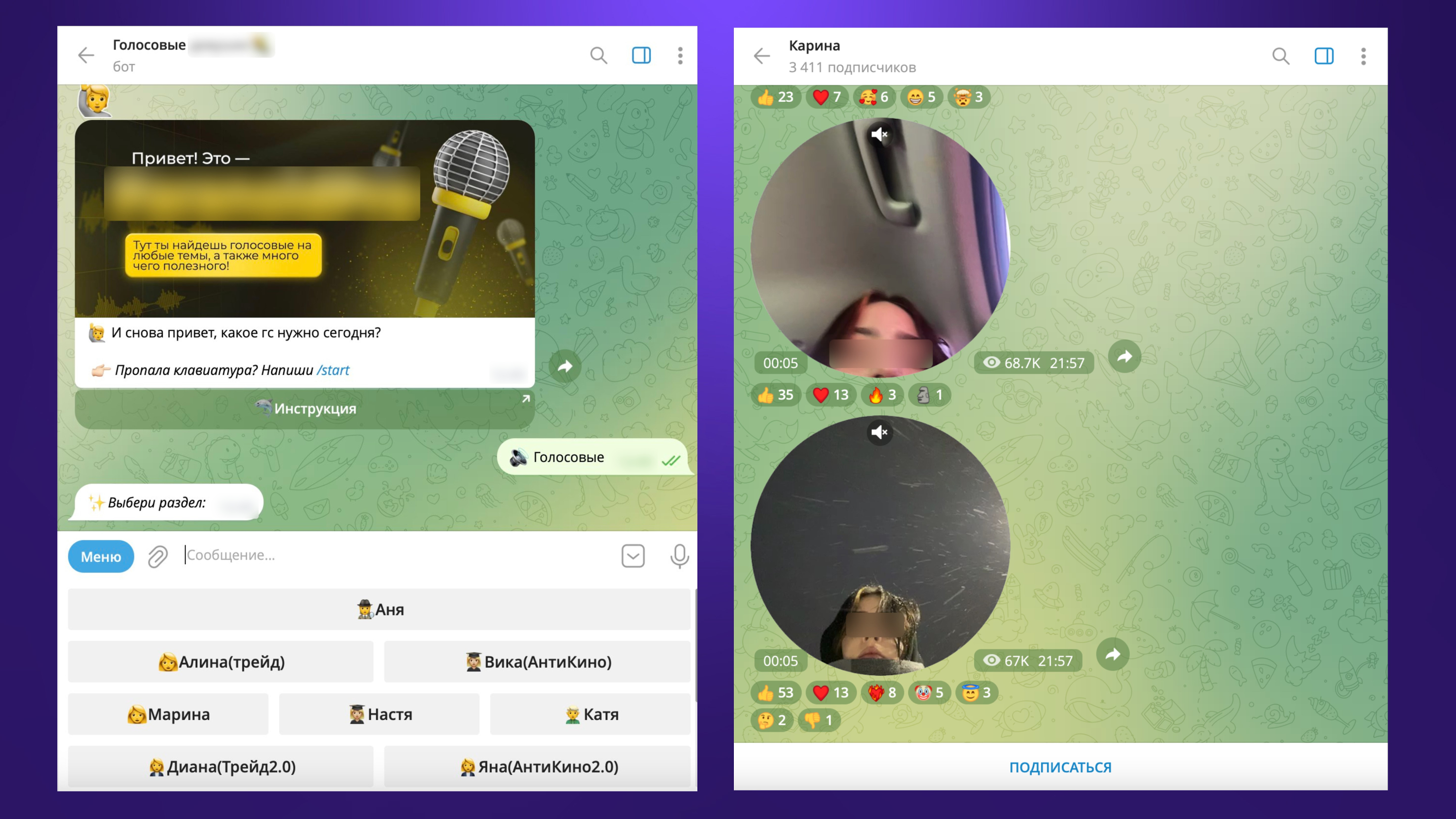 Готовые сообщения под разные вопросы и ситуации общения, а также фото девушек мошенники скачивают из Telegram-бота, созданного организаторами преступной схемы. Фото, видео и голосовые сообщения девушек – настоящие. Впервые такой сервис, когда мошенникам предоставляется готовый набор фотографий, аудио- и видеосообщений от одного человека, злоумышленники использовали в схеме Fake Date ещё несколько лет назад, а теперь распространили на схемы инвестскама.