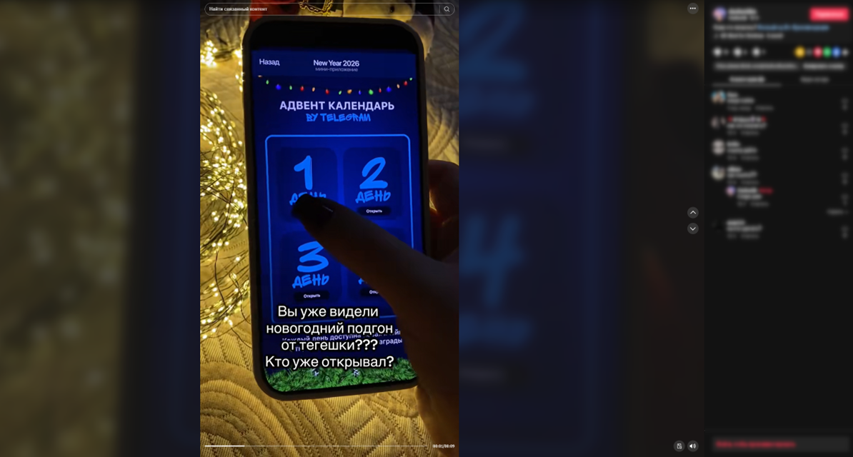 Ещё одна приманка, которую злоумышленники используют этой зимой – предложение получить адвент-календарь. Аналитики Digital Risk Protection F6 обнаружили сценарии, в которых мошенники «раздают» адвент-календари от Telegram, а также известного маркетплейса. Рекламу этих мошеннических приманок размещают в TikTok, а для «получения» календарей требуют перейти по ссылке в комментариях.