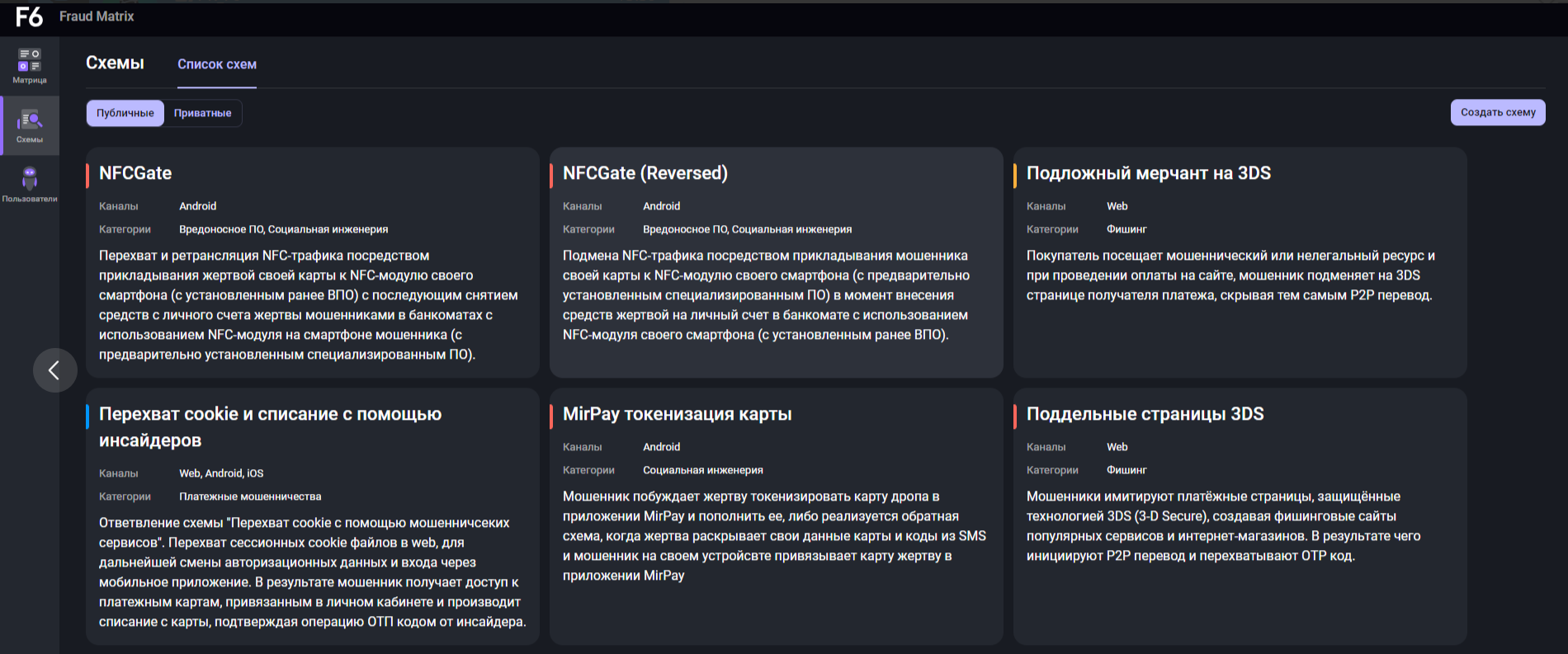 База знаний F6 Fraud Matrix содержит информацию о наиболее актуальных мошеннических схемах, в том числе реальные примеры атак с переписками мошенников и другими данными, которые позволяют детально оценить суть схемы преступников. В свою очередь, пользователи матрицы могут добавить описание новой техники мошенничества, категоризировать саму схему по каналам, по брендам, которые мошенники используют в рамках атак, разложить атаку по техникам, которые используют мошенники.
