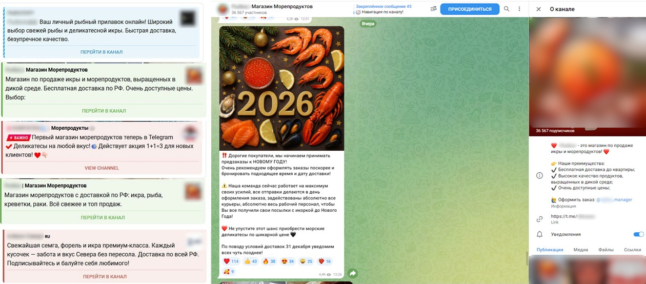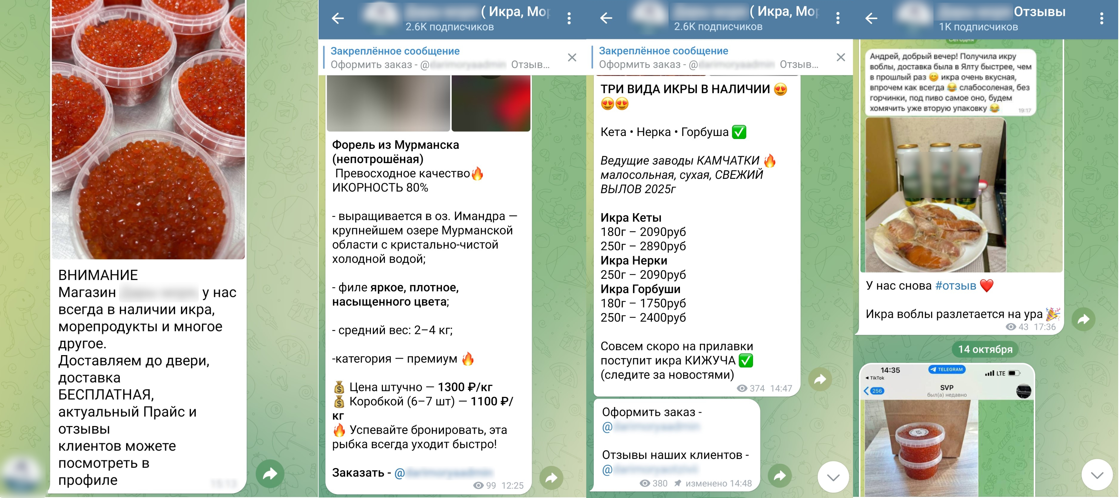 На фоне прогнозов о повышении стоимости красной икры и рыбы перед Новым годом мошенники создали сеть из более чем 30 Telegram-каналов, через которые предлагают пользователям приобрести икру и морепродукты от производителей Дальнего Востока и севера России по низким ценам. Специалисты F6 также обнаружили каналы, которые действуют по аналогичной схеме и через которые скамеры приглашают купить ягоды, фрукты и свежее мясо. Однако икра, красная рыба и морские деликатесы встречаются среди мошеннических предложений значительно чаще: эти продукты стоят дороже, а значит, и ожидаемая прибыль преступников выше.