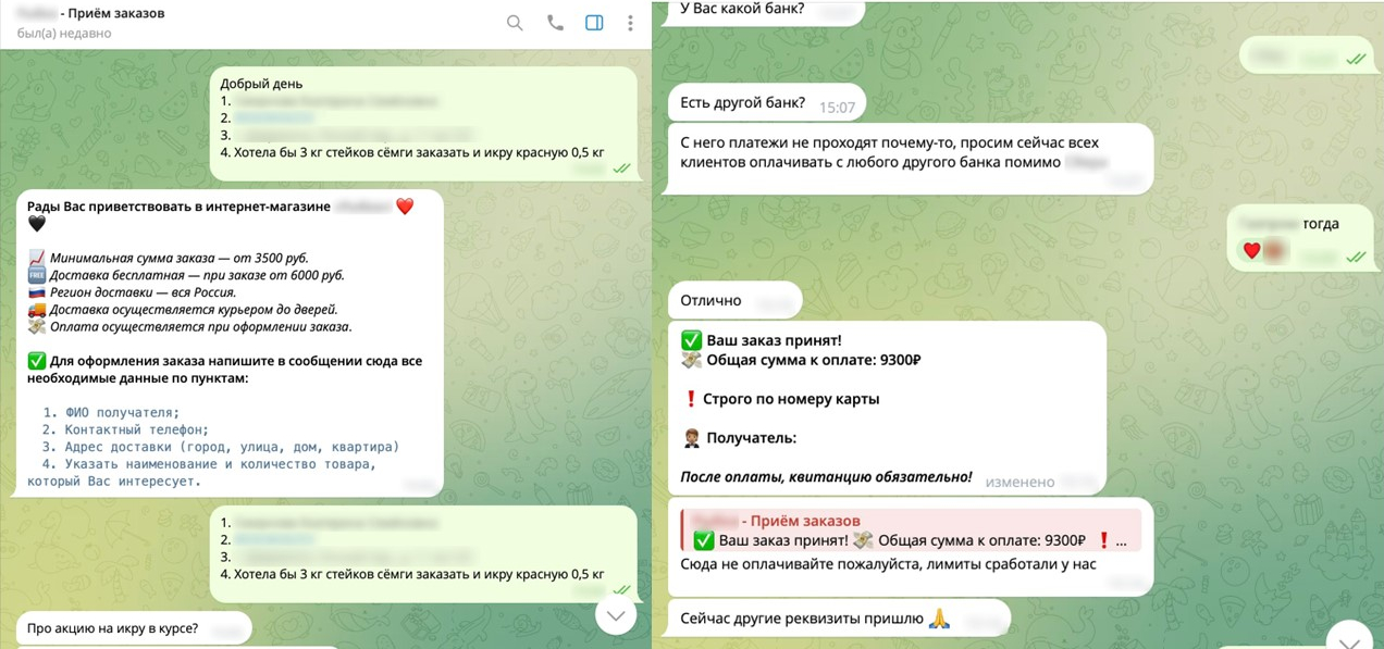 В чат регулярно добавляются новые пользователи, а мошенники создают видимость активности: публикуют сообщения о поставках свежих товаров, обещают быструю доставку и публикуют «интересные предложения с выгодными ценами». Например, за килограмм филе камчатского краба скамеры просят 2200 ₽, за килограмм гребешка, мидий и магаданской креветки – по 1000 ₽, за 250 граммов икры горбушки – 2400 ₽. Покупка – только при условии 100-процентной предоплаты.
