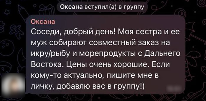 Вторая тактика – под видом «соседа» привлечь внимание пользователей выгодным предложением. Вот так выглядит типичное сообщение от скамеров: «Соседи, добрый день! Моя сестра и её муж собирают заказ на икру, рыбу и морепродукты из {…}. Цены очень хорошие. Кому актуально, пишите в личку, добавлю в группу».