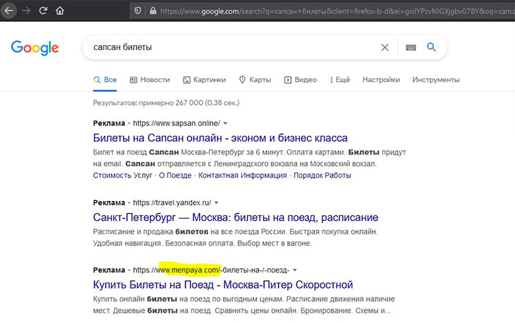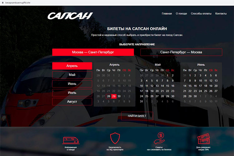 Рис.1. Пример фишингового ресурса по продаже билетов на «Сапсан»