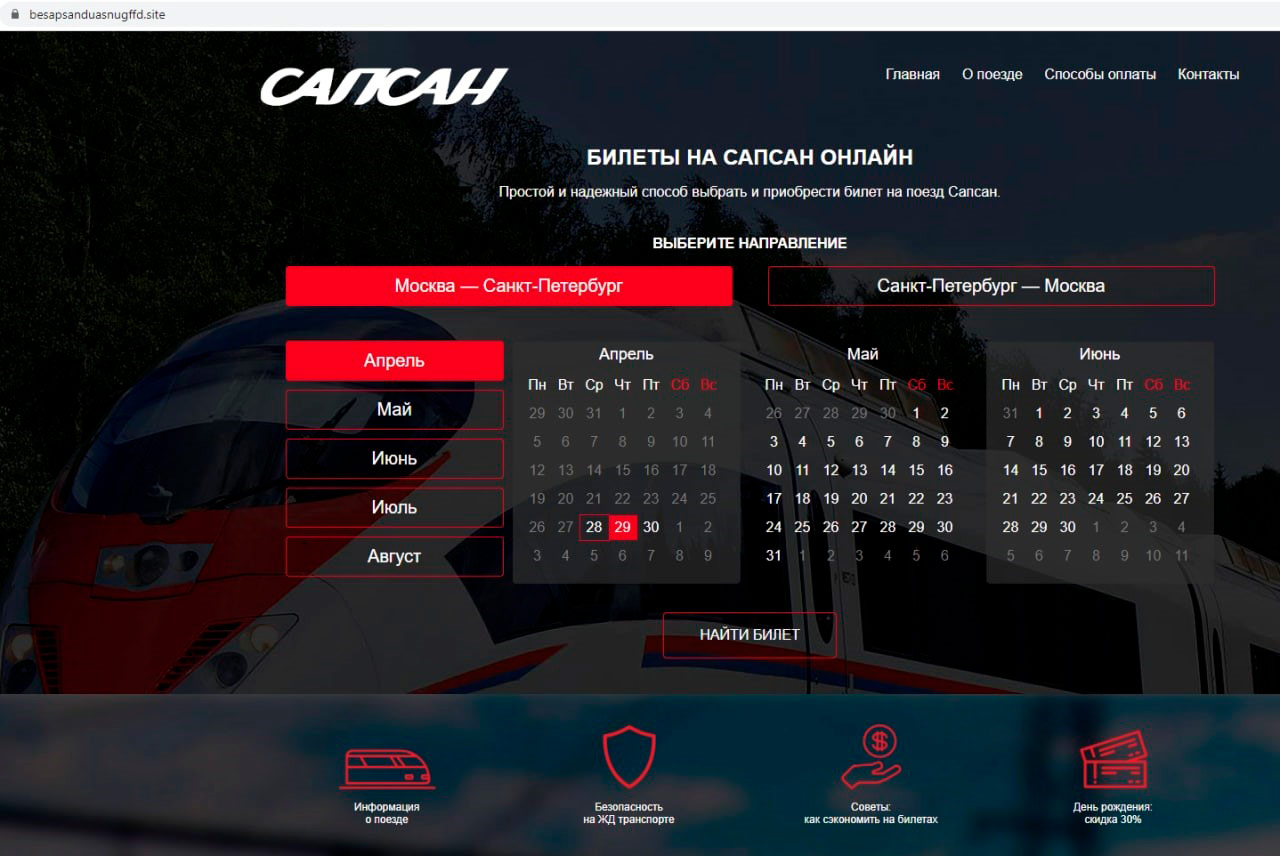 Group-IB, международная компания, специализирующаяся на предотвращении кибератак и расследовании высокотехнологичных преступлений, накануне майских праздников выявила фишинговую атаку на россиян: мошенники создали сеть фальшивых страниц по лже-продаже электронных билетов на поезд „Сапсан„, нацеленных на кражу денежных средств и платежных данных пользователей. Сегодня часть ресурсов еще функционирует, Group-IB совместно с ОАО “РЖД" проводят мероприятия по их блокировке. Эксперты призывают пользователей быть внимательными при покупке билетов на поезд онлайн.