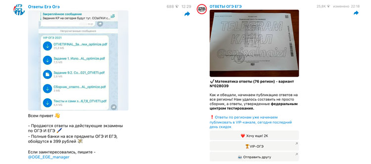 В этом году Единый государственный экзамен (ЕГЭ) проводится с 31 мая по 25 июня 2021 года, а Основной государственный экзамен (ОГЭ) — с 24 мая по 2 июля. По оценкам специалистов Group-IB Digital Risk Protection, пик мошенничества с продажей «ответов» к ЕГЭ и ОГЭ пришелся на конец мая, в преддверии госэкзаменов — на подобные объявления обратили внимание преподаватели школы креативных технологий Tumo. Всего было обнаружено 102 мошеннических ресурса и групп в соцсетях, с суммарным количеством подписчиков более 3,2 млн человек. Количество читателей самого популярного телеграм-канала, где предлагают «слив ответов» достигает 709 969 человек.