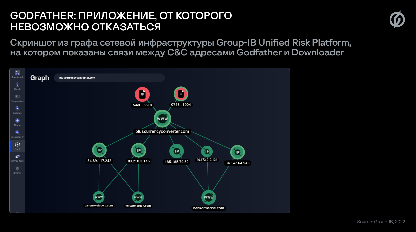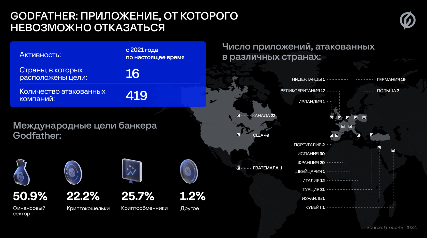 Group-IB, первая частная компания, специализирующаяся на исследовании высокотехнологичной преступности и защите от кибератак, зафиксировала активность банковского Android-трояна Godfather, атакующего пользователей популярных финансовых сервисов. География его жертв охватывает 16 стран мира, а в список целей насчитывает более 400 различных банков, криптовалютных бирж и электронных кошельков. Эксперты Threat Intelligence выяснили, что Godfather распространялся через официальный магазин Google Play под видом легальных криптоприложений.