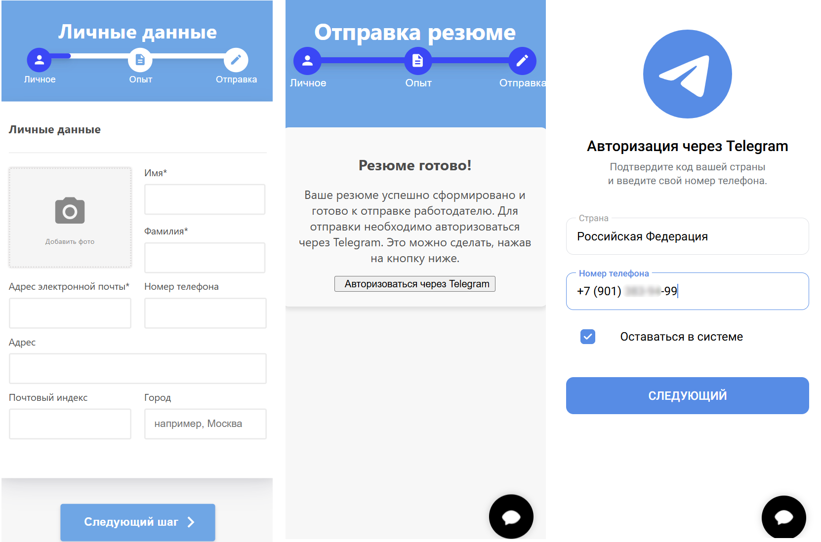 Если пользователь откликнется на фейковую вакансию на сайте бесплатных объявлений или сервисе поиска работы, мошенники спрашивают номер его телефона и сразу же предлагают перевести общение в WhatsApp или Telegram. На этом этапе распознать обман сложно: подобная практика при общении с кандидатами применяется повсеместно. Затем в переписке соискателя просят заполнить резюме и присылают ссылку на фишинговый ресурс. На первой странице предлагается указать личную информацию, включая имя, фамилию, адрес проживания и e-mail, на второй странице – опыт работы и навыки. На третьей странице пользователь видит надпись: «Резюме готово! Для подтверждения отправки резюме вам нужно пройти авторизацию через Telegram». Если пользователь введёт в открывшейся форме номер своего телефона, а в следующей – код подтверждения из смс от Telegram, то злоумышленники моментально получают доступ к его аккаунту.