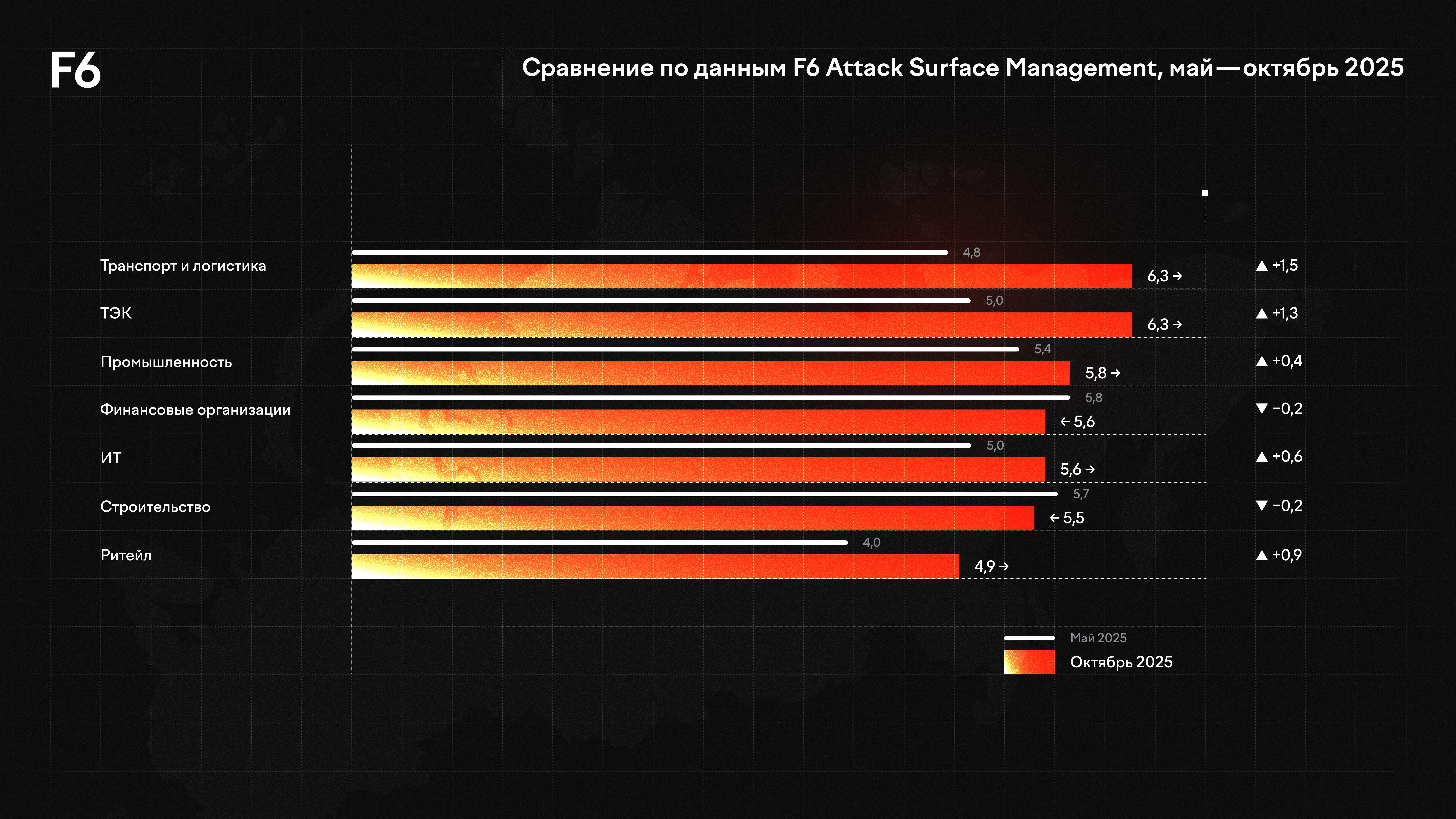Оценка защищенности внешнего периметра организаций построена на данных F6 Attack Surface Management — системы, анализирующей публичные цифровые активы компаний и уровень их управления. Сравнение проведено на основе данных за два квартала — весенний и осенний срезы 2025 года.