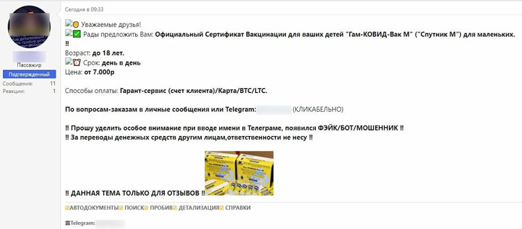 Специалисты Digital Risk Protection Group-IB зафиксировали в интернете за последние 2 недели более 12 800 предложений о продаже сертификатов о вакцинации и QR-кодов, в том числе официальных сертификатов о вакцинации детей «Спутник М». Всего же за последние 3 месяца — с ноября 2021 по январь 2022 года — количество подобных незаконных предложений превысило 110 000. Для сравнения, в сентябре-октябре 2021 года их было чуть более 3 000. По словам экспертов Group-IB, чаще всего подобные услуги можно встретить в Telegram-каналах, а также на специализированных сайтах, в социальных сетях и на теневых форумах.