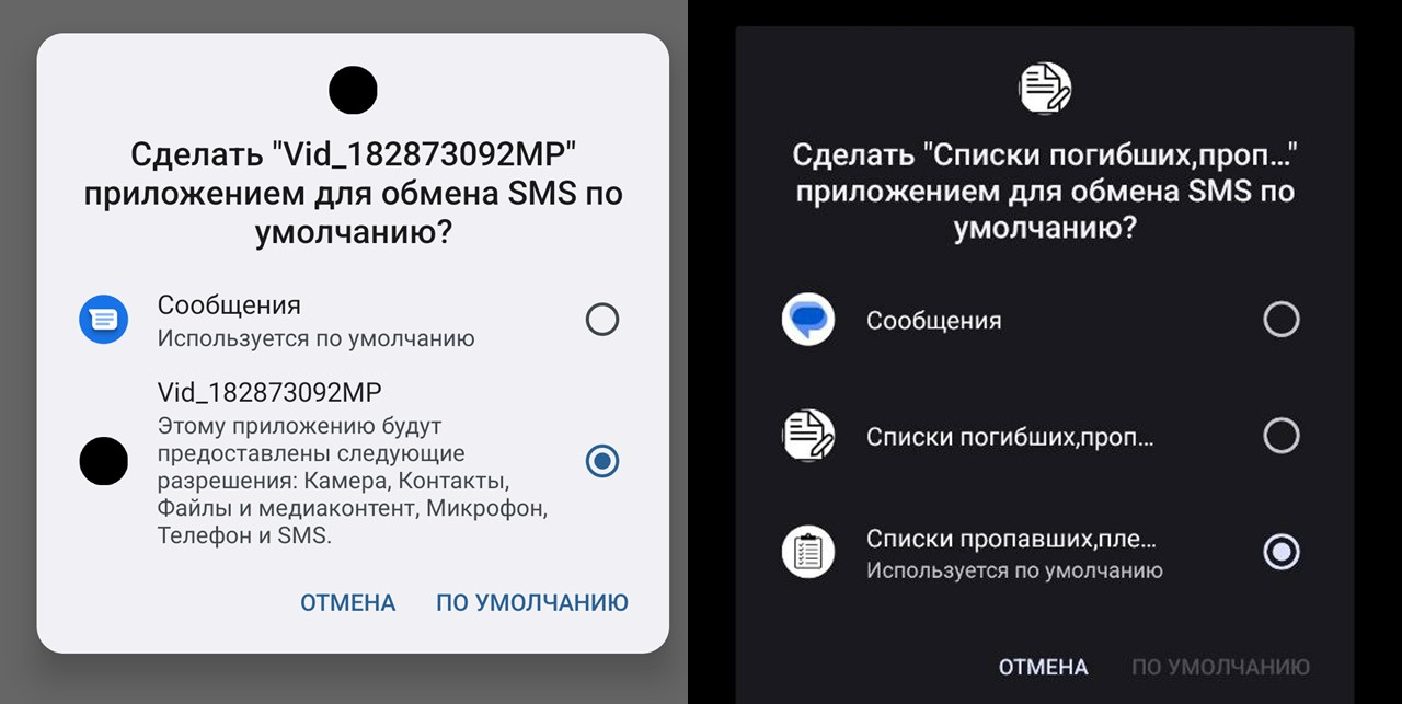 Сразу после установки вредоносного ПО происходит запрос опасного разрешения на установку основного приложения для обмена СМС по умолчанию. Это разрешение требуется Mamont для дальнейшей работы с СМС на устройстве жертвы.