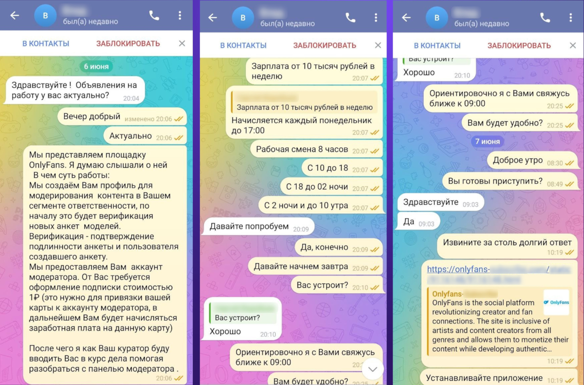 В переписке злоумышленники сообщают, что ищут сотрудников для OnlyFans. Это популярный сервис для взрослых, недоступный для пользователей из России. Соискателям объясняют, что в первое время они будут верифицировать новые анкеты моделей, для чего потребуется создать свой аккаунт в приложении.