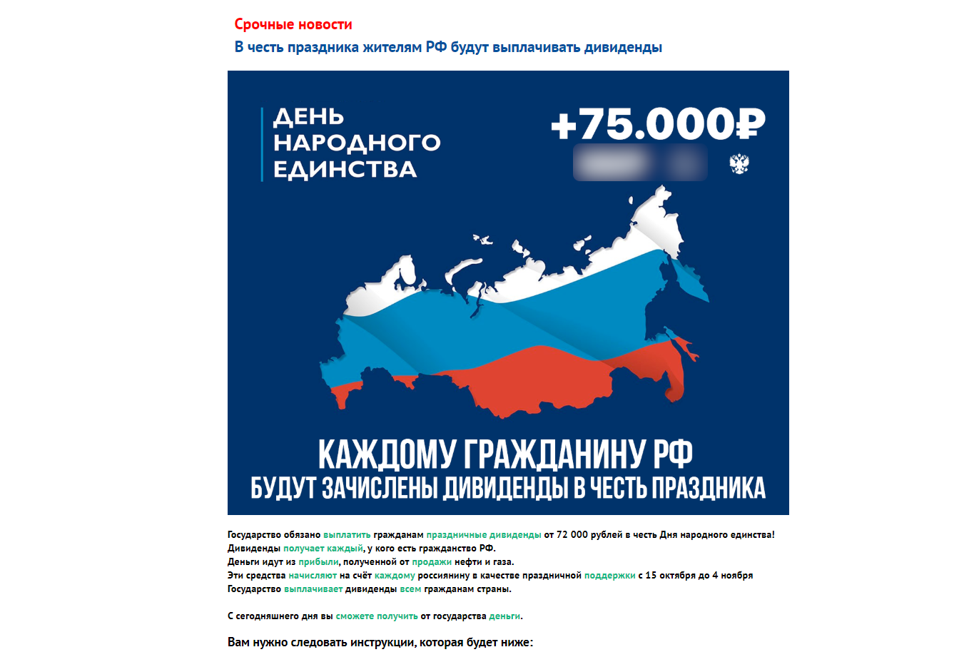 Злоумышленники создали более 300 однотипных сайтов-приманок, на которых размещена ложная информация о выплате гражданам России от государства 75 тысяч рублей в честь Дня народного единства. Мошеннические ресурсы сообщают, что «праздничные дивиденды от продажи нефти и газа» якобы начисляют до 4 ноября.