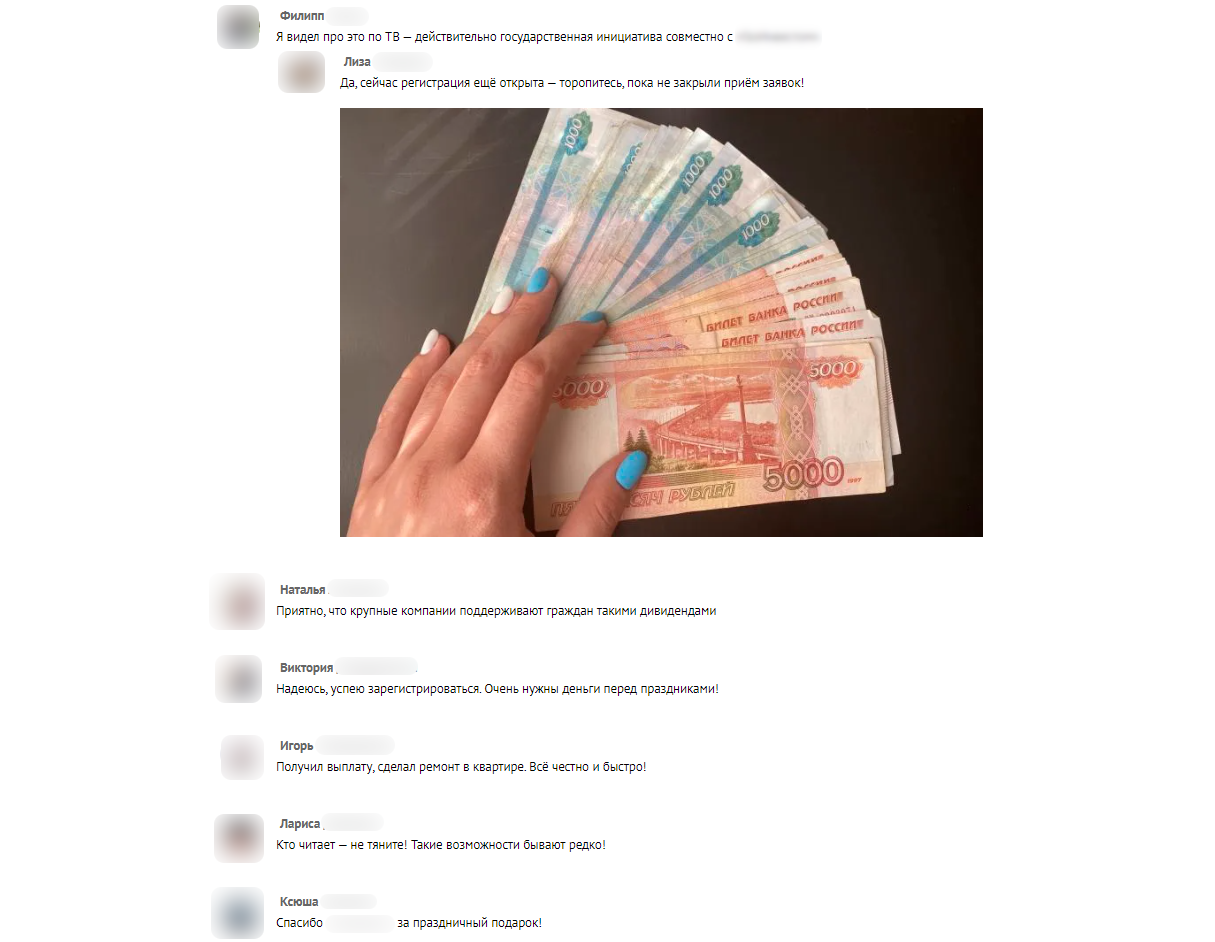 Скамеры стремятся вызвать доверие к обещаниям «дивидендов», публикуя фейковые отзывы от имени пользователей, якобы получивших выплаты.