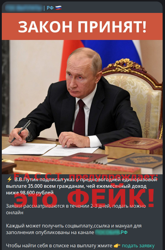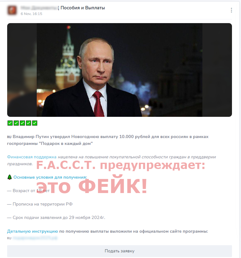 В начале декабря 2024 года злоумышленники начали очередную массовую атаку на жителей России с применением таких фейков. Аналитики департамента защиты от цифровых рисков (Digital Risk Protection) компании F6 зафиксировали распространение в социальных сетях и Telegram-каналах фейковых сообщений об установлении от имени президента России разовых «предновогодних» выплат. В одних мошеннических публикациях указано, что такую несуществующую выплату в 10 тысяч рублей могут получить все граждане России старше 18 лет, проживающие на территории нашей страны. В других фейках говорится о выплате в 35 тысяч рублей для всех граждан, имеющих доход ниже определённого уровня, суммы указываются разные. Для придания правдоподобности этим сообщениям мошенники используют фотографии Владимира Путина, а также ссылку на вымышленную госпрограмму «Подарок в каждый дом».