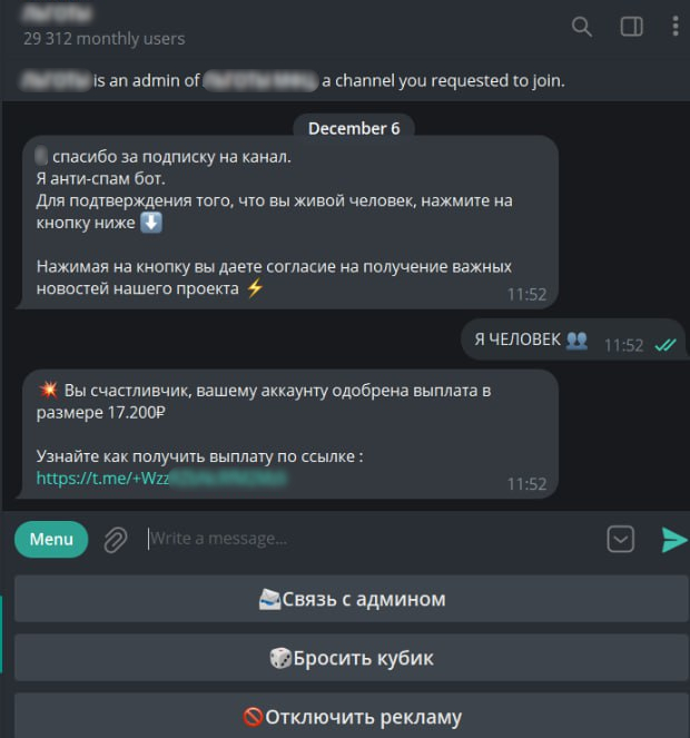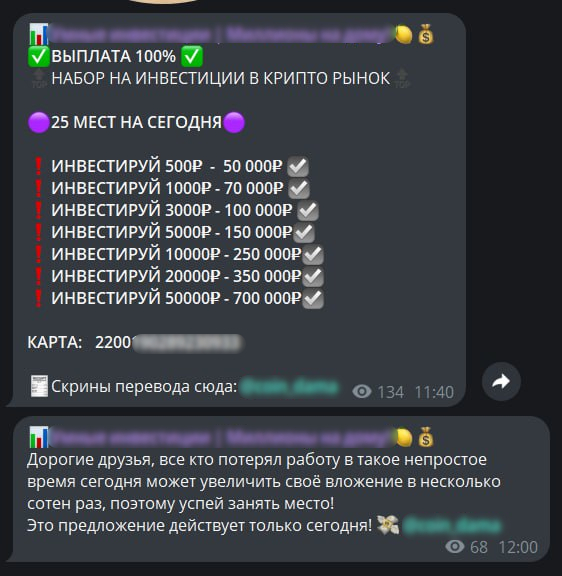 «Ссылки из ложных новостей про несуществующие выплаты ведут на мошеннический Telegram-канал, в котором предлагается инвестировать деньги в криптовалюту и увеличить свои вложения в сотни раз. Мошенники предлагают потенциальным жертвам перевести эти деньги напрямую на банковскую карту, номер которой указан в этом же сообщении. Следует учитывать риски, которые возникают при подписке на мошеннические Telegram-каналы. Даже если человек не реагирует на фейковые новости и не переходит по предлагаемым ссылкам, сразу после подписки злоумышленники получают данные о нём, его аккаунте, и могут впоследствии использовать эту информацию для других киберпреступных атак».