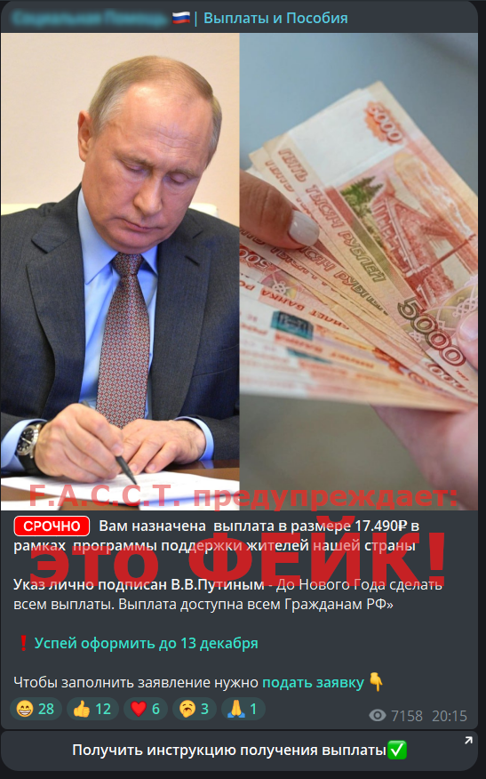 В начале декабря 2024 года злоумышленники начали очередную массовую атаку на жителей России с применением таких фейков. Аналитики департамента защиты от цифровых рисков (Digital Risk Protection) компании F6 зафиксировали распространение в социальных сетях и Telegram-каналах фейковых сообщений об установлении от имени президента России разовых «предновогодних» выплат. В одних мошеннических публикациях указано, что такую несуществующую выплату в 10 тысяч рублей могут получить все граждане России старше 18 лет, проживающие на территории нашей страны. В других фейках говорится о выплате в 35 тысяч рублей для всех граждан, имеющих доход ниже определённого уровня, суммы указываются разные. Для придания правдоподобности этим сообщениям мошенники используют фотографии Владимира Путина, а также ссылку на вымышленную госпрограмму «Подарок в каждый дом».