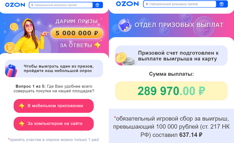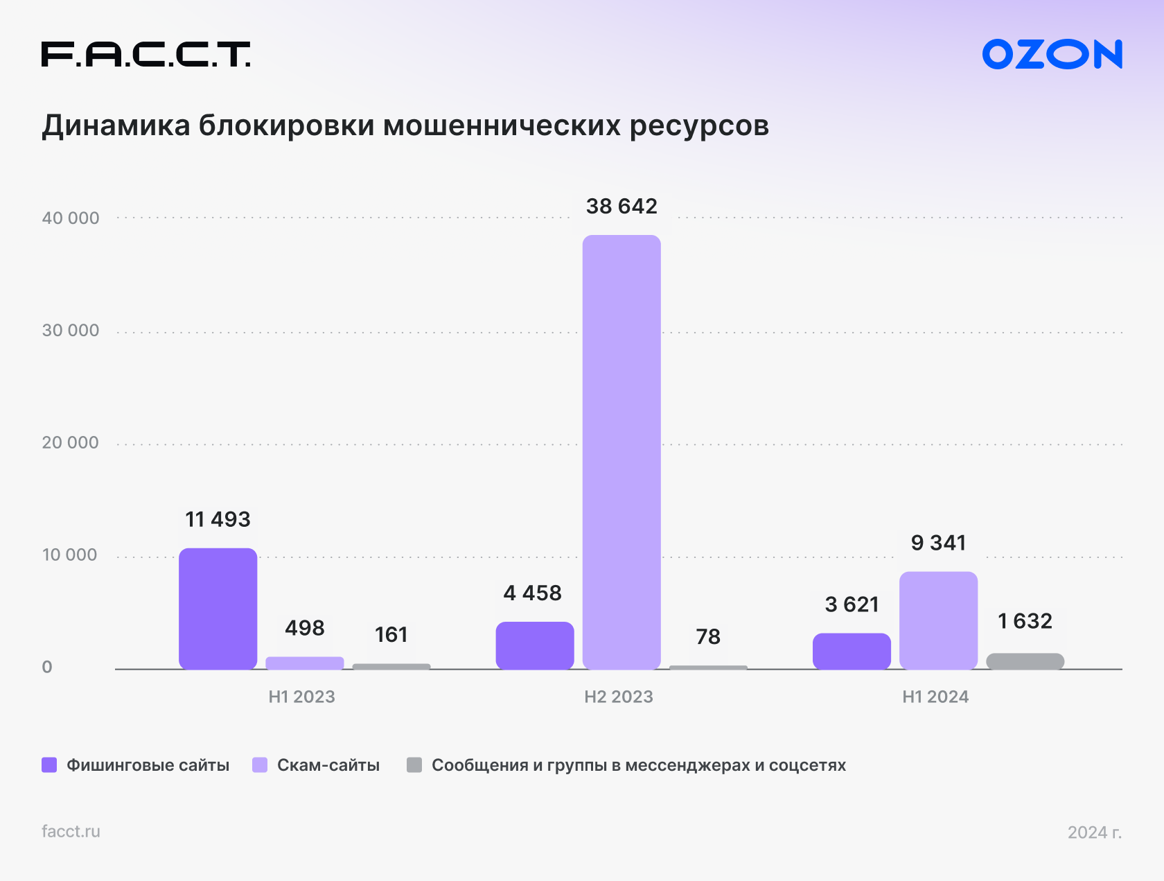 Ozon, ведущая e-commerce-платформа в России, и компания F6, российский разработчик технологий для борьбы с киберпреступлениями, в первом полугодии 2024 г. заблокировали 9 341 скам-ресурсов и 3 621 фишинговых сайтов, которые пытались использовать бренд маркетплейса для обмана пользователей. Основными видами мошенничества, с которыми чаще всего сталкивались специалисты, стали интернет-аферы с фейковыми розыгрышами от имени маркетплейса, фишинговые страницы авторизации, покупки или возврата товара. Главный способ продвижения мошеннических сайтов в этом году — это реклама в мессенджерах и соцсетях.
