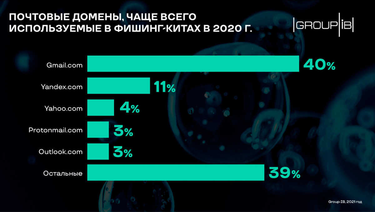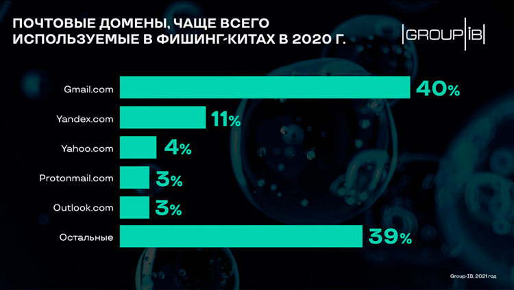 Команда CERT-GIB (Центр мониторинга и реагирования на инциденты информационной безопасности Group-IB) проанализировала инструменты для создания фишинговых страниц, так называемые, фишинг-киты, и выяснила, что в 2020-м году с их помощью фишинговые сайты чаще всего создавались под различные онлайн-сервисы (онлайн-шоппинг, онлайн-кинотеатры и др.), электронную почту, а также под финансовые организации. Суммарно Group-IB обнаружила фишинг-киты, нацеленные свыше чем на 260 уникальных брендов в России и за рубежом.