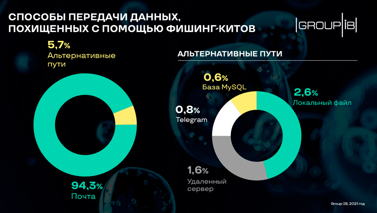 Альтернативные пути получения украденных злоумышленниками данных можно разделить на локальные, когда они записываются в файл, расположенный на самом фишинговом ресурсе, и удаленные когда они отправляются на сторонний сервер. Для передачи украденных данных злоумышленники активно используют легитимные сервисы. Так, в прошлом году началось широкое применение в фишинговых наборах Google-форм, а также выгрузка украденных данных в специально созданные приватные Telegram-боты. Суммарно на альтернативные способы пока приходится порядка 6%, но вероятнее всего их доля будет расти, а основное увеличение придется на Telegram в силу простоты реализации схемы и анонимности мессенджера.