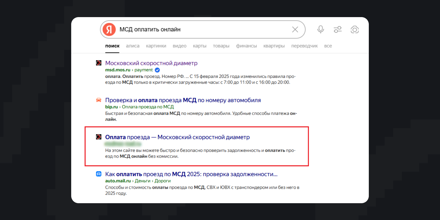 Обнаруженные сайты визуально похожи на официальные ресурсы и свободно индексируются в поисковых системах. Один из вредоносных доменов, предлагающий оплатить проезд по Московскому скоростному диаметру, оказался даже на верхних строках поисковой выдачи.