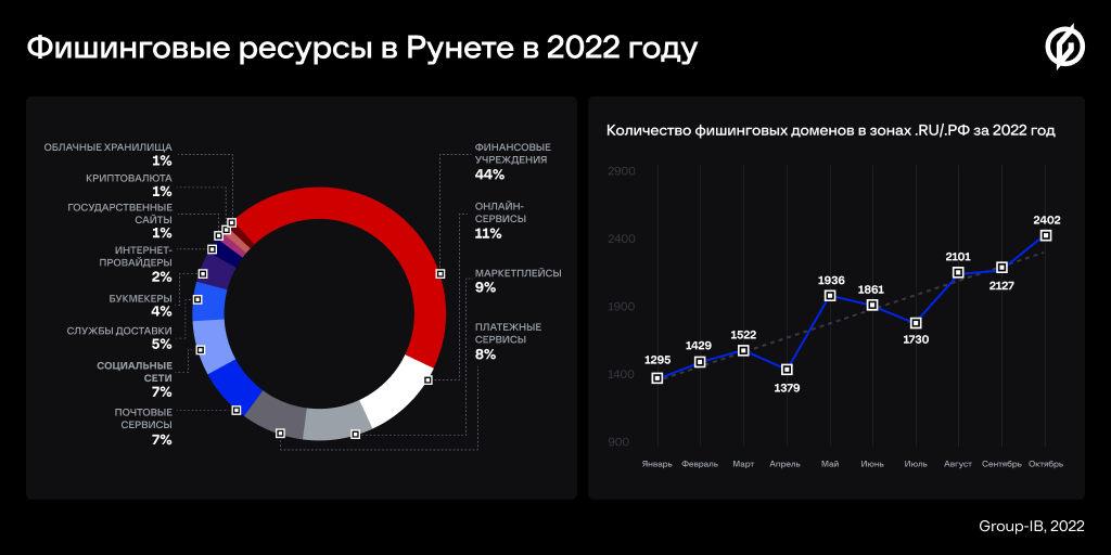 Компания Group-IB, один из мировых лидеров в сфере кибербезопасности, обнаружила в 2022 году в российском сегменте интернета около 18 000 фишинговых сайтов, что на 15% больше, чем годом ранее. Такой рост эксперты связывают с масштабированием популярной мошеннической схемы «Мамонт» (FakeCourier). Чаще всего в качестве приманки мошенники используют фишинговые ресурсы под видом банков, онлайн-сервисов и платежных систем. На данный момент рост запросов на блокировку вредоносных сайтов от авторизованных партнеров в Координационный центр доменов.RU/.РФ (КЦ) составил 25%. Наибольшее количество запросов на разделегирование мошеннических доменов было направлено специалистами круглосуточного Центра реагирования на инциденты информационной безопасности СERT-GIB (24/7).