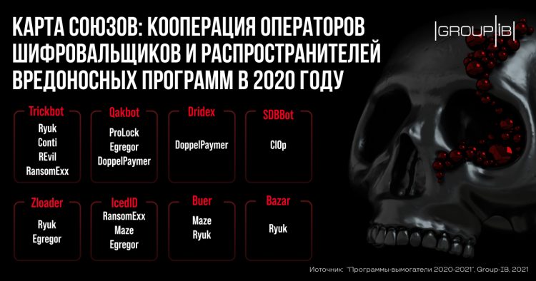 Еще одна тенденция 2020 года коллаборации между разными преступными группами. Group-IB Threat Intelligence & Attribution system зафиксировала в прошлом году появление в андеграунде 15 новых публичных партнерских программ-вымогателей. Действующие преступные группы, использующие вредоносные программы Trickbot, Qakbot и Dridex, все чаще помогали операторам программ-вымогателей получать первоначальный доступ к корпоративным сетям.