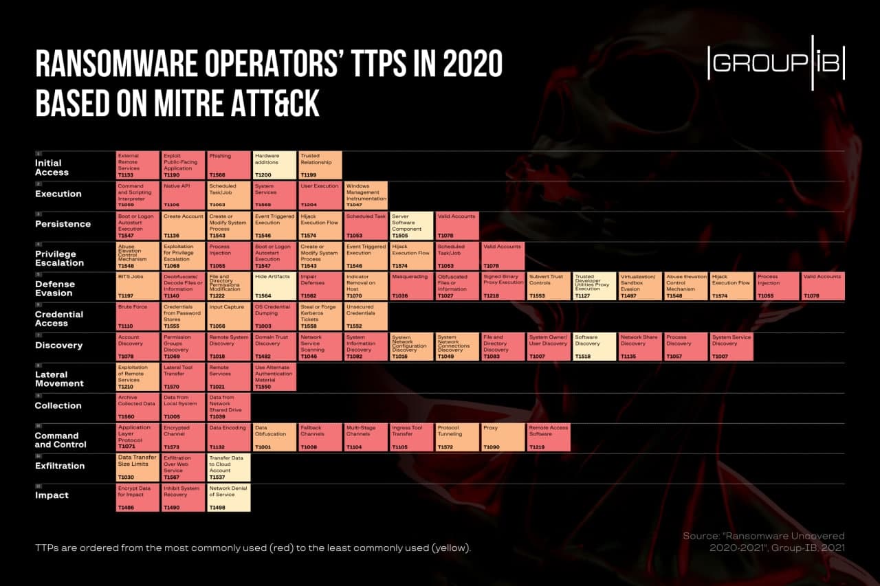 Учитывая, что большинство атак шифровальщиков управляются человеком «вручную», специалистам по информационной безопасности критически важно понимать, какие тактики, техники и процедуры (TTP) используют злоумышленники. Полный технический анализ TTPs атакующих, сопоставленных в соответствии с MITRE ATT&CK®, публичной базой знаний, в которой собраны тактики и техники целевых атак, а также рекомендации по поиску и обнаружению угроз, собранные командой Group-IB Digital Forensics and Incident Response (DFIR), уже сейчас доступны в новом отчете «Программы-вымогатели 2020-2021» .
