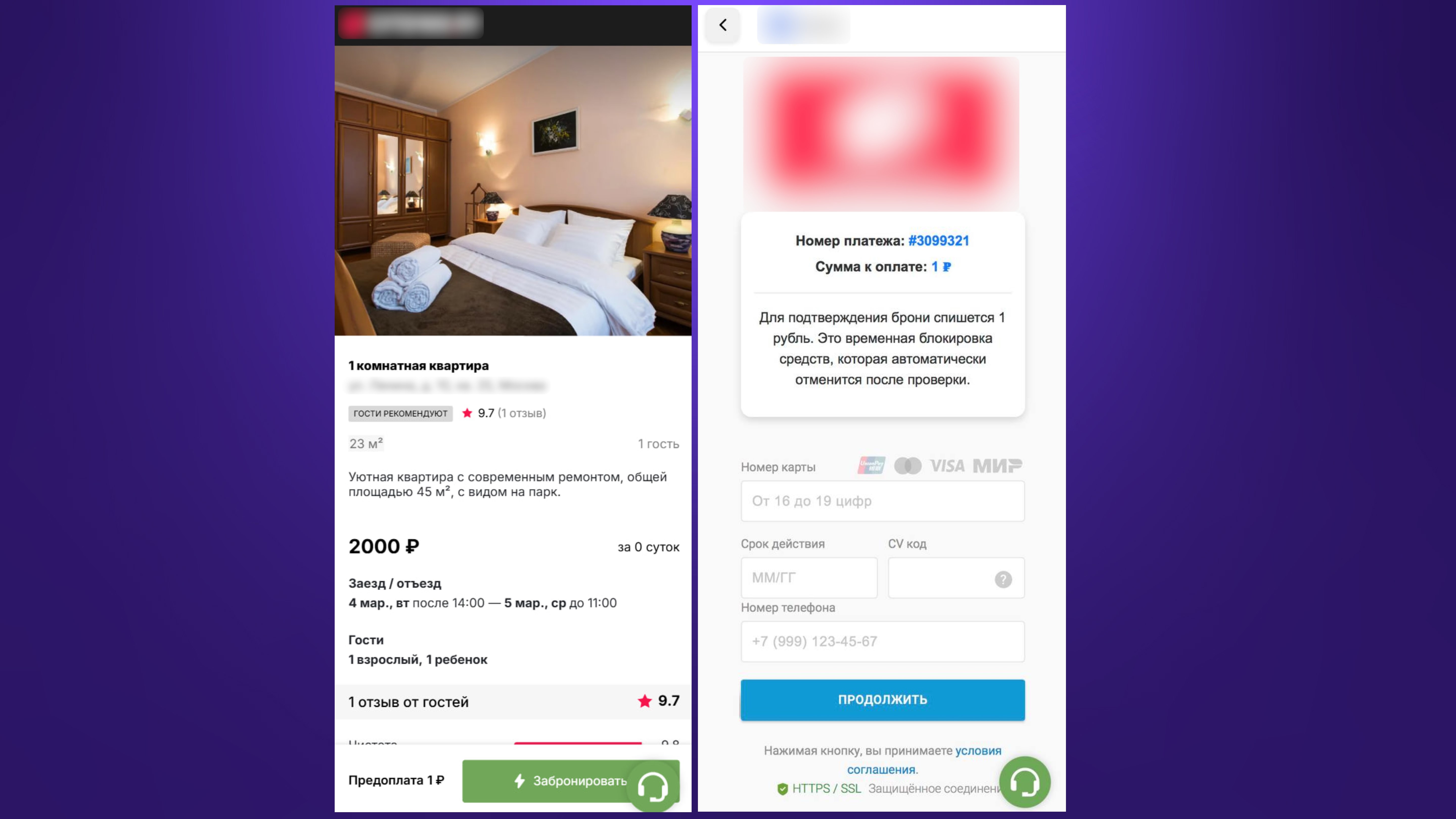 Дальнейшие действия зависят от операционной системы смартфона жертвы. При переходе по ссылке пользователи устройств на iOS видят страницу фейкового сервиса с фотографиями квартиры, ценой и кнопкой «Забронировать». После выбора дат заселения отображается сумма аренды. После нажатия кнопки «Оплатить» – страница с формой для ввода данных банковской карты, а затем – кода из СМС. Мошенники могут попросить прислать им код или скриншот с кодом в личные сообщения.