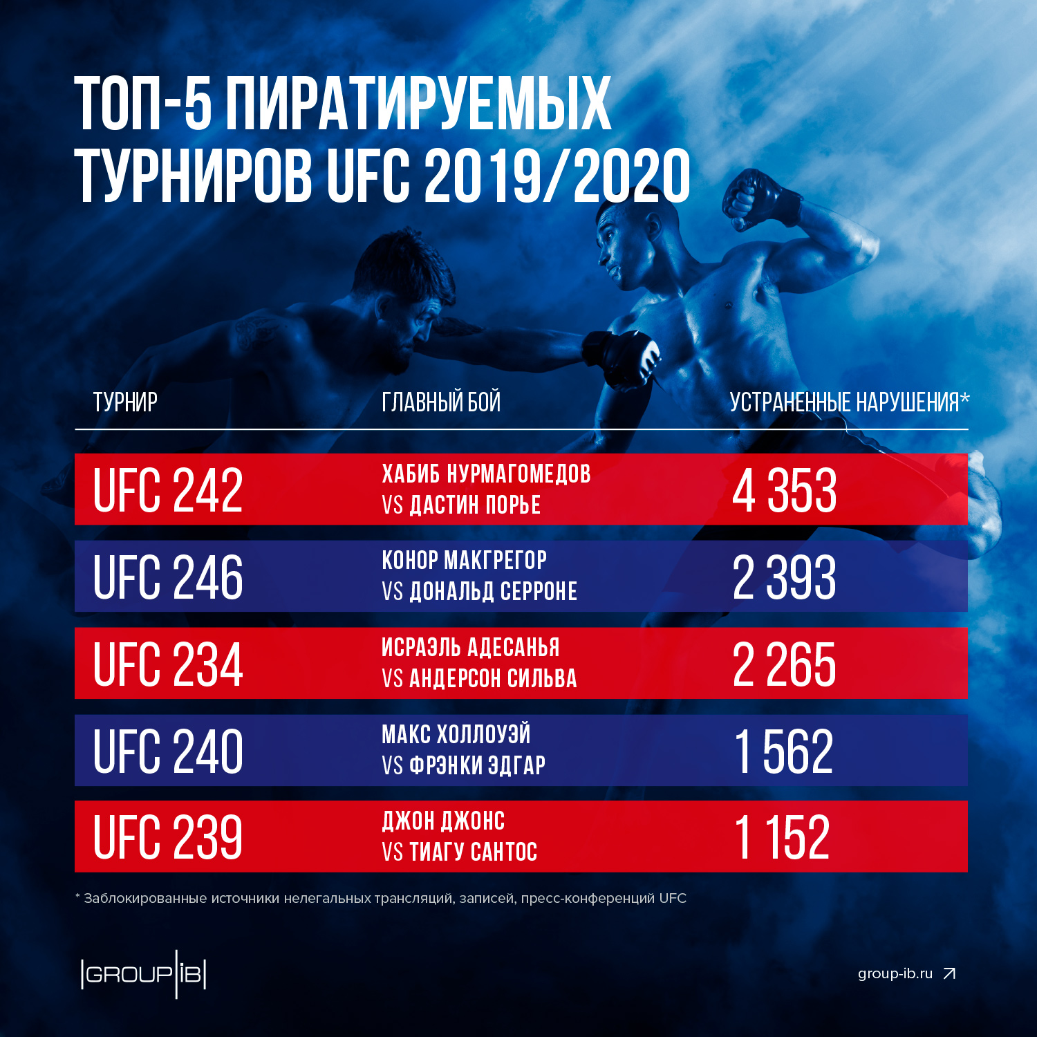 Group-IB, международная компания, специализирующаяся на предотвращении кибератак, с начала 2019 года выявила и заблокировала более 77 000 ссылок на нелегальные трансляции и записи поединков UFC, международной спортивной организации, проводящей соревнования по смешанным единоборствам во всем мире. Наибольшей популярностью в указанный период у пиратов пользовался бой на турнире UFC 242 между Хабибом Нурмагомедовым и Дастином Порье, а самым масштабным каналом продвижения пиратского видео в России стали социальные сети.